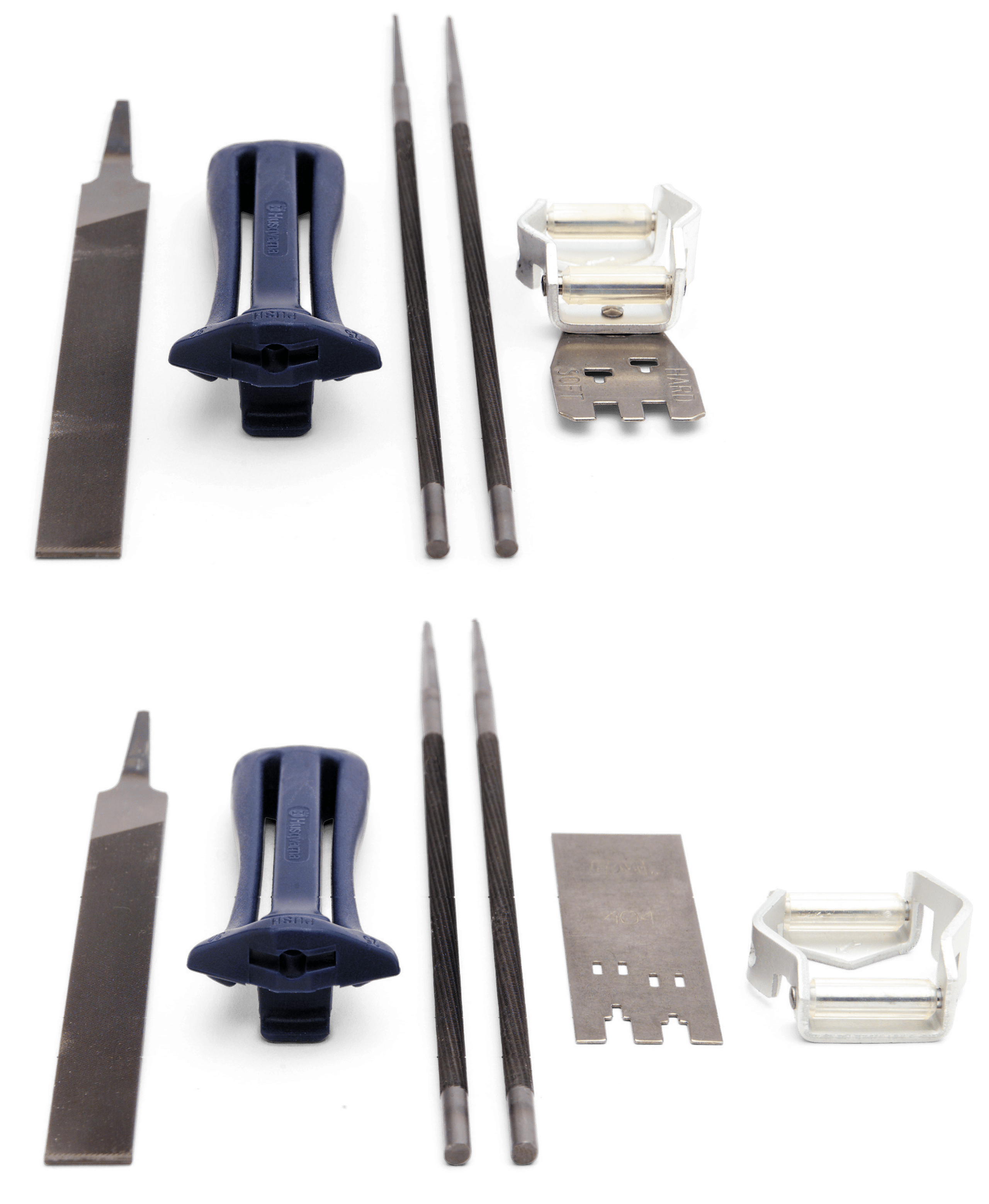 Komplet med filskaft, kombimål, 2 stk. rundfile og 1 stk. fladfil. Med kombimålet opnås den rigtige filevinkel og filehøjde på savtanden, og kombimålet gør det nemt at file rytteren i den rigtige højde.