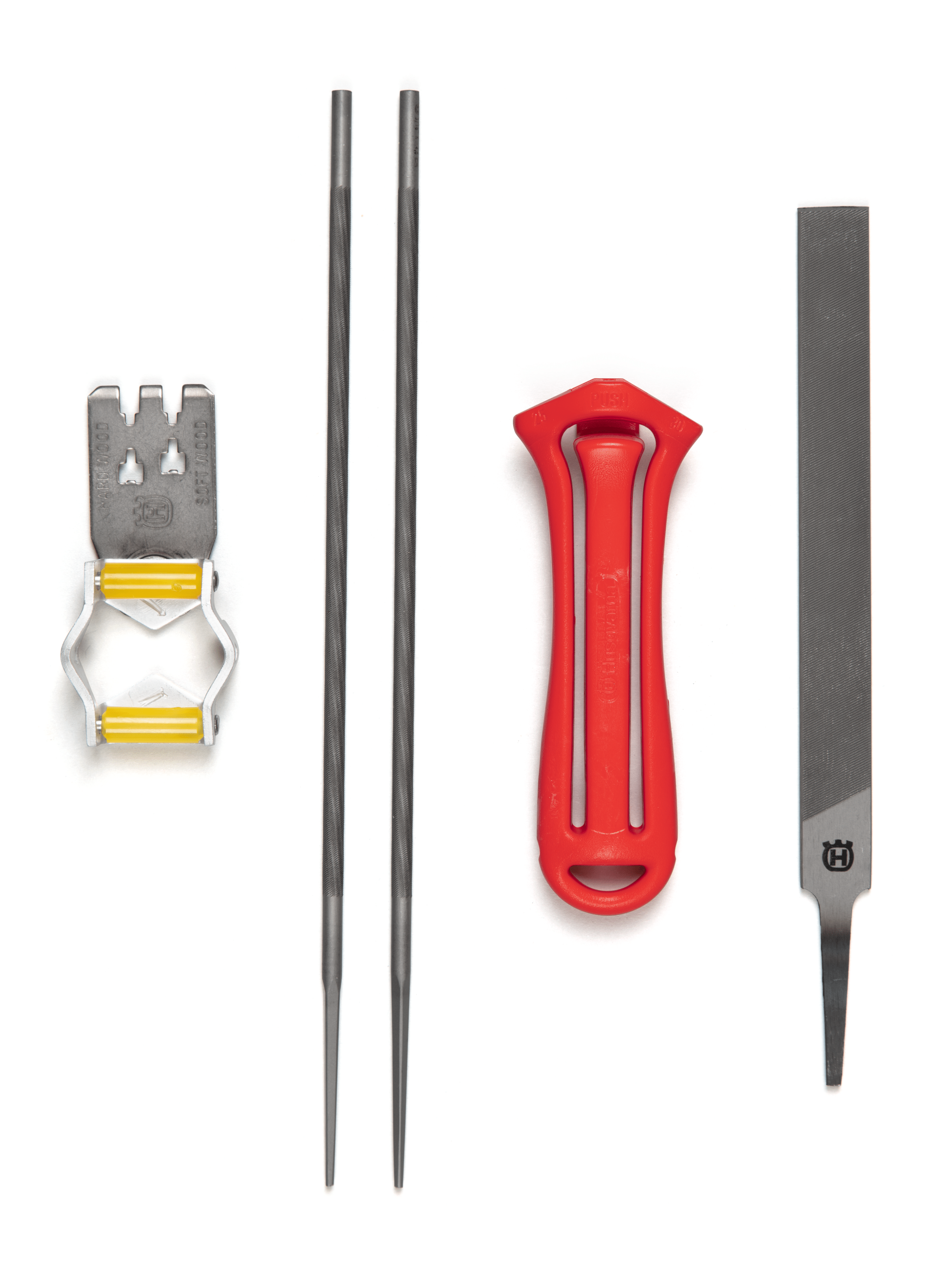 Komplet med filskaft, kombimål, 2 stk. rundfile og 1 stk. fladfil. Med kombimålet opnås den rigtige filevinkel og filehøjde på savtanden, og kombimålet gør det nemt at file rytteren i den rigtige højde.