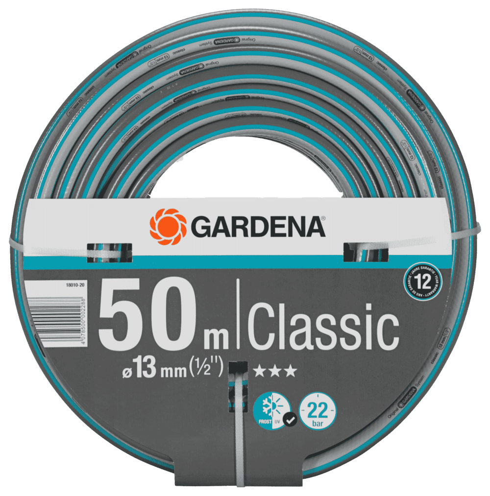 Classic Slange 13 mm (1/2″) fra GARDENA er 50 m lang med en slangediameter på 13 mm (1/2″). Takket være strukturen i slangen er den både stabill og fleksibel. Ved vanding af planter eller ved rengøringsarbejde sørger haveslangens elasticitet for, at den ikke så let slår knuder eller bliver snoet. Den er UV- og frostbestandig, så den kan være udenfor hele året. Vandslangen er velegnet til et sprængtryk på op til 22 bar. Den er fri for forurening og derfor fri for phthalater (<0,1 %) samt cadmium, bly og barium (<0,1 %). Da Classic slangen er en del af Original GARDENA System, kan du nemt tilslutte andre systemdele eller tilslutningsenheder til den. GARDENA giver dig 12 års producentgaranti på produktet, der er fremstillet i Europa.