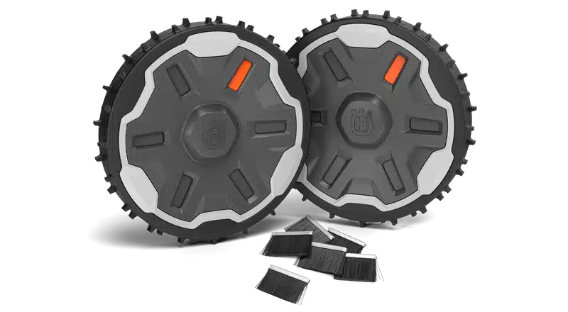 Hjulsæt til ujævnt terræn som indeholder grovprofilhjul og hjulbørster, for fantastisk kørsel på ujævne og skrånende græsplæner