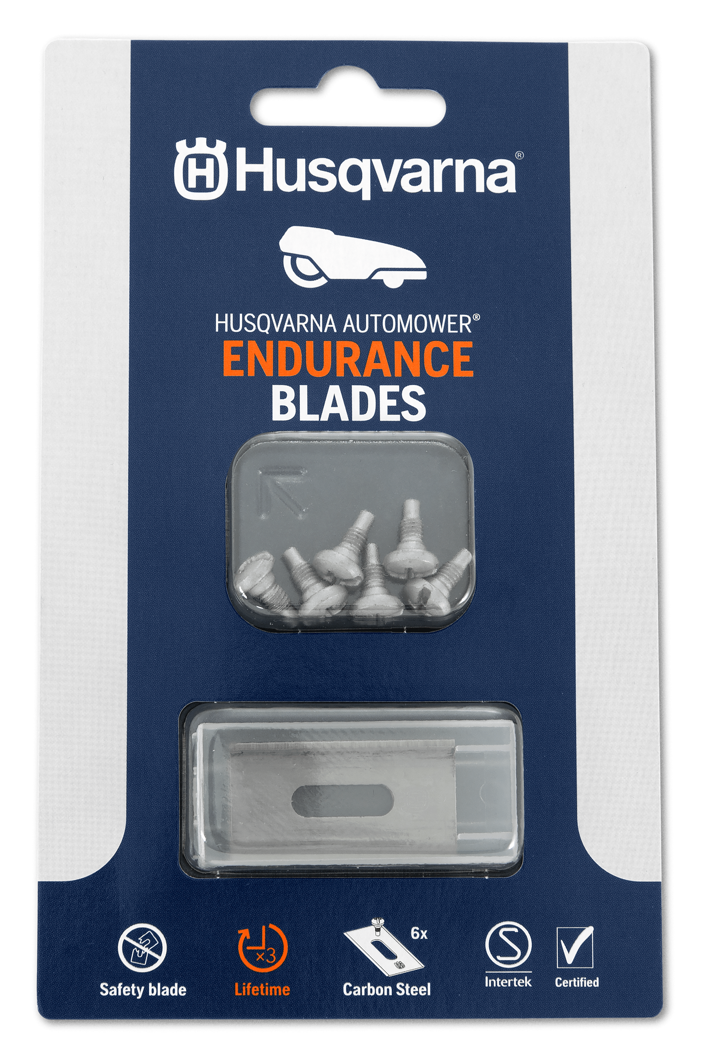 Husqvarna Automower® Endurance knive giver mere end dobbelt så lang levetid som klassiske knive. Husqvarna Automower® Endurance-knive giver mere end dobbelt så lang levetid som klassiske knive. Husqvarna Endurance-designet giver et bedre klipperesultat ved at give skærekanter på alle fire sider og en hårdere og skarpere kant. Sikkerhedskniv i henhold til standarderne.
