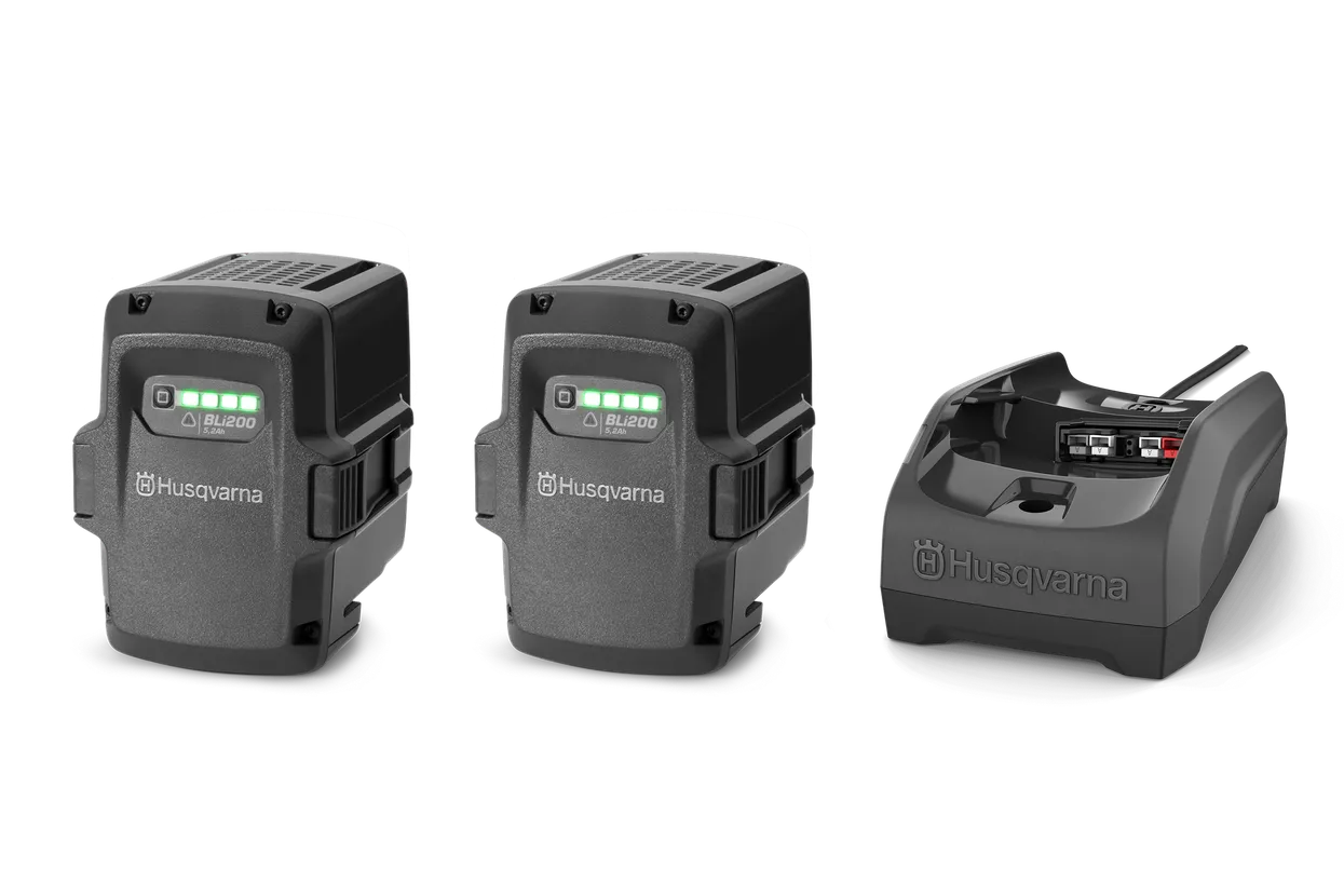 Husqvarnas batteri- og opladerkit, inkl. 2 stk. BLi200-batterier og 1 stk. 40-C80-oplader.
