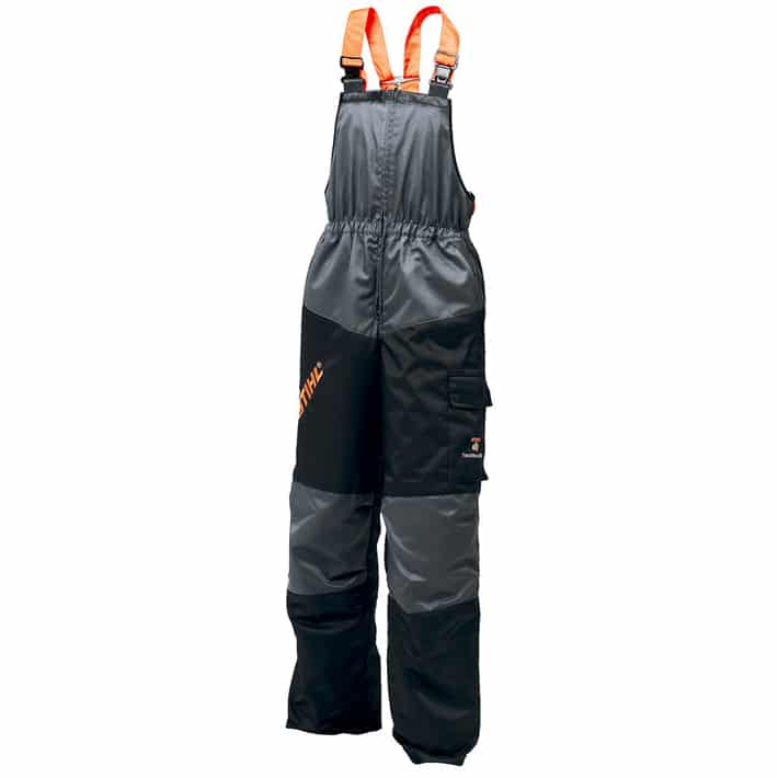 Meget slidstærke sikkerhedsbukser i overall-model med skæreindlæg på forsiden. Sikkerhedsklasse 1, design A. Sort og gråt yderstof behandlet med Scotchguard så det både er smuds- og vandafvisende. For i 80% polyester og 20% polyamid. Store praktiske lommer på låret. Vi anbefaler at du vasker bukserne regelmæssigt for at bibeholde den optimale sikkerhedsfunktion.