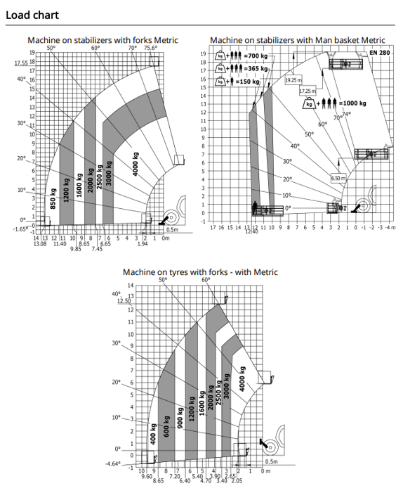På billederne kan du se maskinens mål og dimensioner. Du kan derudover se et løftediagram.