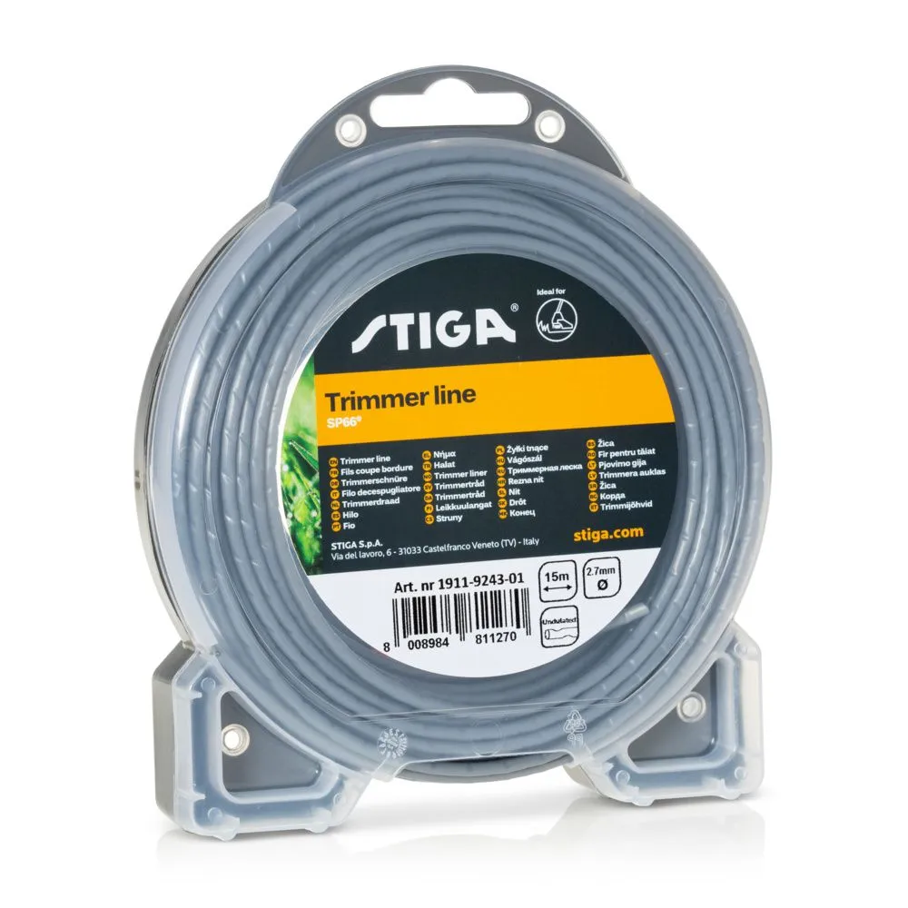 Riflet SP66®-trimmertråd med en diameter på 2,7 mm til STIGA græstrimmere og buskryddere. Pakken indeholder 15 meter tråd. SP66® er den eneste trimmertråd designet specifikt til batteridrevne produkter. Dette særlige produkt har en meget slidstærk, patenteret sammensætning. Derudover giver den aerodynamiske form mindre luftmodstand, færre vibrationer og et lavere støjniveau. Disse energibesparende funktioner forlænger batteriets levetid.